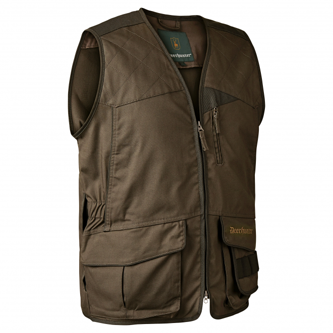 With numerous high-quality details with reinforcements that ensure long durability. Breathable and with water- and dirt-repellent impregnation. The padded shoulder inserts reduce recoil impact. The 2-way stretch material provides extra freedom of movement and a good fit. With chest pocket with zip, two slit pockets, two front pockets with pocket flap and detachable cartridge holder, elastic insert at the waist and rabbit pocket. Colour: dark elm. Material: 63% polyester, 34% cotton, 3% spandex.