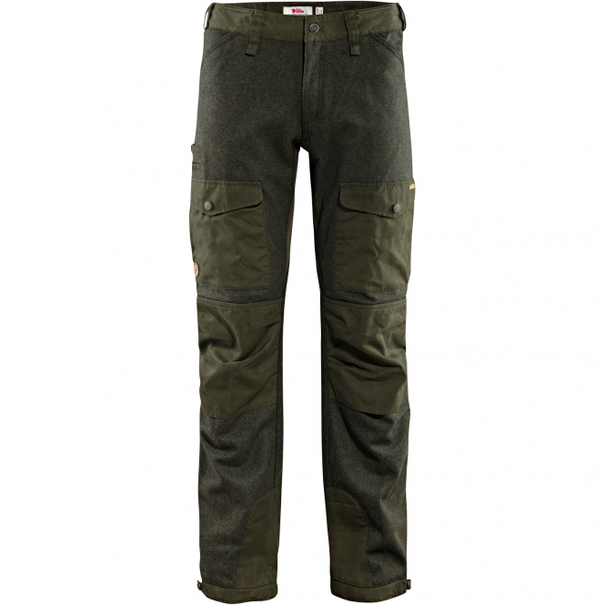Durable, weatherproof hunting trousers made from recycled wool. Reinforced with G-1000 Silent Eco on the back, pockets, waistband, inside calves and leg ends. Stretch at crotch and back yoke. Colour: green. Material: 80 % wool, 20 % polyamide, reinforcement: 65 % polyester, 35 % cotton. Stretch: 63 % polyamide, 26 % polyester, 11 % elastane.