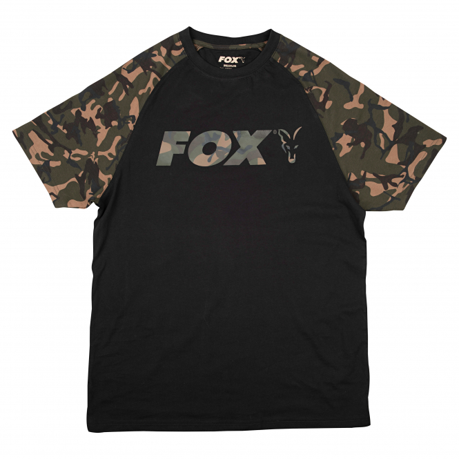 - Black body, unique Fox camo print raglan sleeves