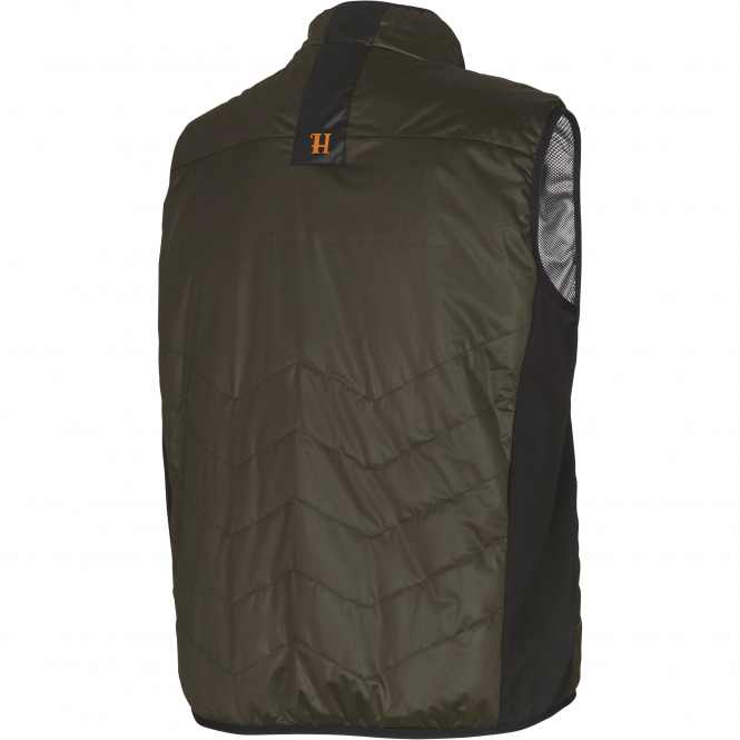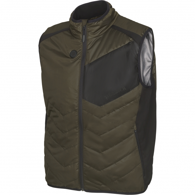 The Härkila Heat Vest is made of a lined, lightweight fabric with stretch membranes on the sides. The heat-reflective lining prevents heat loss and enhances the effect of the integrated heat membranes. The high collar is lined with soft fleece. There are integrated thermal membranes in the particularly cold-sensitive areas of the upper body – between the shoulder blades and in the lumbar region. With the help of the associated smartphone app, these heat membranes can be set to a desired temperature between 30 and 52 °C as needed. In addition, the membranes can also be set to 38, 46 or 52 °C without a smartphone or app using the push button on the chest. Unlike older heat technologies on the market, the heat membranes of the Härkila Heat Vest are so flexible that the waistcoat can still be folded effortlessly. In addition, the waistcoat can be machine washed without hesitation. In the right pocket of the waistcoat is a waterproof USB stick, so that a powerbank can be connected if needed or desired (powerbank not included). With a 10,000 mAh powerbank, the waistcoat will reach the maximum temperature of 52 °C for around 7 hours at outside temperatures of 0 °C. To save power, the heat membranes automatically switch to sleep mode when the waistcoat has reached the desired temperature. They then switch on again by themselves when the temperature drops 1-2 degrees below the set value. The waistcoat therefore has a heat-regulating function: the heat membranes switch off automatically when the body produces a lot of heat, e.g. during high activity, and switch on again when you stand or sit. The waistcoat has two side pockets, an inside pocket and a radio pocket on the left chest. Colour: willow green/black. Outer material: 100% polyester, polyurethane-coating, lining: 100% polyester.