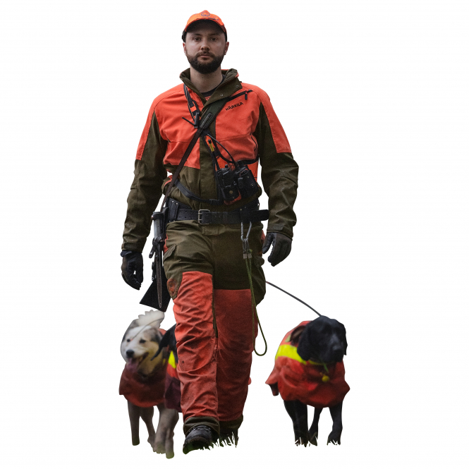 The Wildboar Pro pants are made of a strong, durable, wind-, water- and dirt-repellent canvas material called AirTechTM. On the entire front and from the buttocks to the back of the knees, the pants are equipped with a special protective knit of strong polyethylene. Thanks to this feature, the pants have been certified by the German testing bodies for agricultural and forestry technology KWF (Das Kuratorium für Waldarbeit und Forsttechnik) and DPLF (Deutsche Prüf- und Zertifizierungsstelle für Land- und Forsttechnik) and confirmed as a protective product for wild boar hunting. In addition, the pants are equipped with a windproof and waterproof GORE-TEX® membrane, which has a high water column and is also extremely durable and breathable. The pants have been treated with a DWR (Durable Water Repellent) treatment, which repels water and dirt. Ventilation zippers with sewn-in mesh material are located on the thigh sides to provide relief during high activity. Other features include open, slanted front pockets and two roomy pockets on the sides of the thighs. The right thigh pocket is equipped with a cartridge holder for four rounds. The left inner pocket is divided with a Velcro closure so that equipment such as knives and cell phones can be conveniently stored separately. Thanks to the sewn-in hooks in the ankle area, the pants can be attached to the laces of boots. The Wildboar Pro pants offer adjustment options at the ankles and in the back of the knees. This allows the pants to be widened in the knee area, which is especially advantageous when hunting, where a high degree of freedom of movement is important. On the left side there is a D-ring for attaching various equipment. Colour: green/orange.