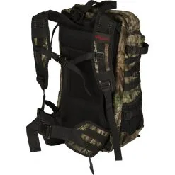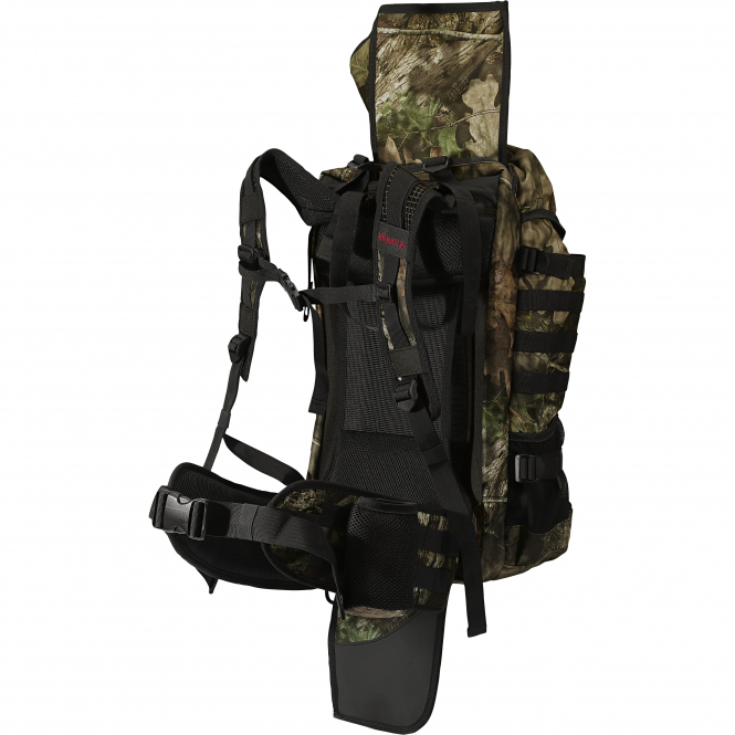 The Moose Hunter 2.0 backpack holds 36 litres and is made from the same soft, quiet, brushed tricot fabric as the other products in the Moose Hunter 2.0 series. Another common feature is the Mossy Oak® Break-Up Country® camouflage. The rucksack has a detachable rifle or shotgun holder so you can carry your weapon on your back and have it quickly to hand when needed. Thanks to the wide and flat carrying straps, you can shoot effortlessly even with the backpack on, as the straps do not get in the way when shouldering the weapon. The straps are ventilated, as are the back panel and the strong lap belt, so that moisture is quickly wicked away from the body during high activity levels. On the sides, the backpack is equipped with compression straps and two pockets for water bottles or other equipment. There is also an elastic drawstring at the front for compressing the backpack and for securing various equipment. Closure with click buckle. There is a hidden pocket under the lid and a snow guard. The backpack is lined with strong red polyester, so you can easily see the contents even in low light conditions. The sides of the backpack and the wide waist belt are also equipped with a Molle system to which various equipment can be attached at will. The backpack also includes a GPS holder for attachment to the Molle system. An emergency whistle is integrated into the click system of the carrying straps. Dimensions: 58 x 22 x 15 cm. Volume: 36 L. Colour: Mossy Oak® Break-Up Country® camouflage.