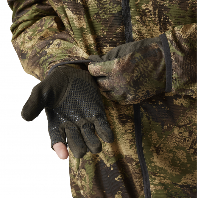 Full-stretch gloves with half index fingers for perfect control on the trigger. The palms have an anti-slip coating. Colour: camo. Material: 100% polyester.