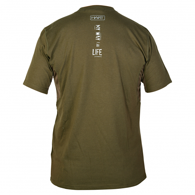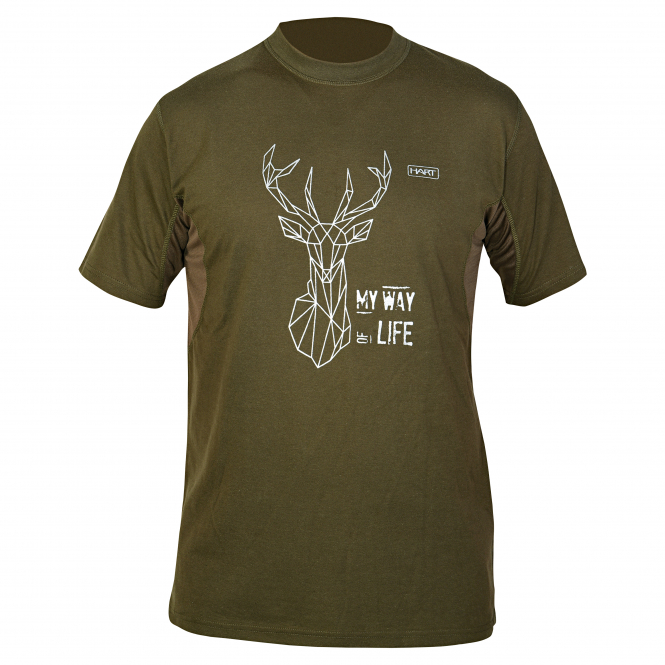 in the underarm area for better ventilation. The motif shows geometric representations of various animals. Color: green. Material: 80% cotton, 20% polyester, mesh fabric: 100% polyester.