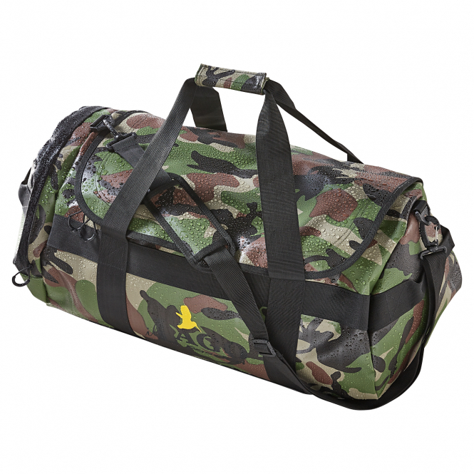 Waterproof weekend bag. A spacious inner compartment, an outer pocket and a mesh pocket offer sufficient storage space. Can also be worn as a shoulder bag. Made of 500D Tarpulin PVC. Dimensions: 64 x 36 x 36 cm. Capacity: approx. 80 litres. Colour: camou.