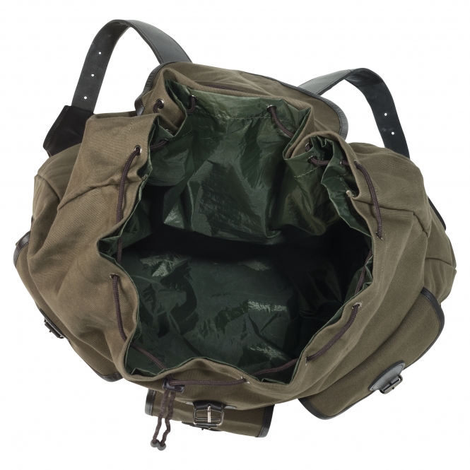 Large mountain backpack with removable weld inlay. Perfect for transporting just hunted game. Three large outside pockets offer enough space for hunting accessories like flashlight or knife. The attached cord lock and leather cuffs on the metal clasps are also quiet. With carrying handle and padded adjustable straps. Dimensions: 60 x 65 cm.