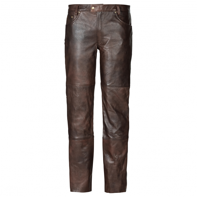 Classic cut 5 pocket trousers made of smooth leather, which can be closed by a zipper, button and hook. With belt loops. The unabridged leg grippers can be adapted easily to the body size. Colour: dark brown. Outer material: leather, Lining: 100% polyester.
