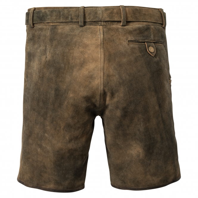 Classic leather shorts for hunting or traditional costume. The high-quality goat suede is comfortable to wear, absolutely silent and additionally extremely durable. 2 side pockets with additional coin pocket, the side piped pocket and the piped pocket with button closure at the back offer enough space. The decorative belt is variably adjustable and provides optimal support. Colour: brown. Upper: leather, bag pouch: 100% polyester.