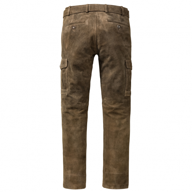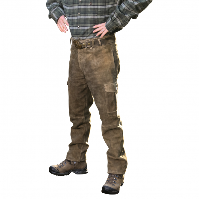 Classic leather pants for hunting or traditional costume. The high quality goat suede is comfortable to wear. Side buttoned pockets are perfectly placed for ammunition or papers. The decorative belt is variably adjustable. Color: olive / brown. Upper material and waistband lining: 100% leather, pocket and leg lining up to the knee: 100% polyester.