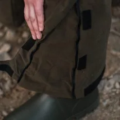 Warm women hunting trousers with suspenders for a secure fit. With elastic band in the pelvic area, extended back, adjustable leg ends and 2 fluffy side pockets with water-repellent zipper. Colour: olive. Material: 100% polyester.