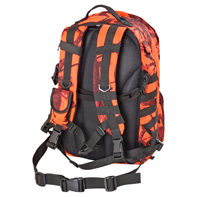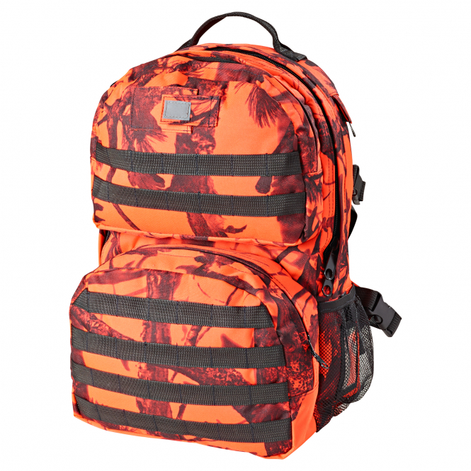 Waterproof hunting backpack in GhostCamo-design. 2 outer pockets, 1 pocket for water reserves, Reflective Eight orientation window, a map pocket on the bottom, back protector, reinforced and adjustable ergonomic straps and carrying handle. Dimensions: 50 x 33 x 20 cm. Volume: 40 l. Colour: GhostCamo blaze & black. Material: 100% polyester.
