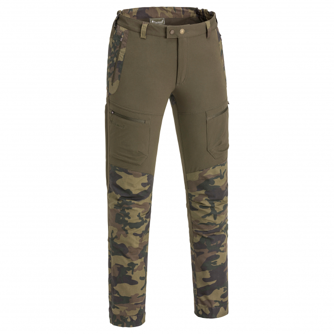 Water repellent pants with modern fit. 2 leg pockets with zipper. With plastic hooks on the inside of the legs to attach boots. Color: camou. Material: 96% polyamide, 4% elastane.