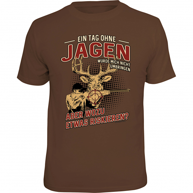 Comfortable, straight-cut short-sleeved shirt with a high round neckline. Ideal for a trip to the area, but also suitable for everyday life. The large print and the german lettering on the front illustrate in a humorous way your love for the hobby: “A day without hunting would not kill me – but why risk something?”. The material is comfortable to wear. Colour: brown. Material: 100% cotton.
