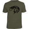 Comfortable, straight-cut short-sleeved shirt with a high round neckline. Ideal for a trip to the area, but also suitable for everyday life. The hunting print and the large german lettering at the front clearly show your love for the hobby: “I chase my food myself!”. The material is comfortable to wear. Colour: olive. Material: 100% Cotton.