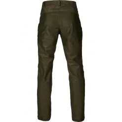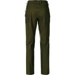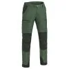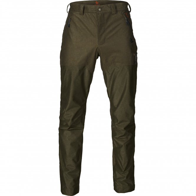 A durable pant with front and thigh pockets with water resistant zippers and an elastic waistband. Color: pine green melange. Material: 100% polyester.