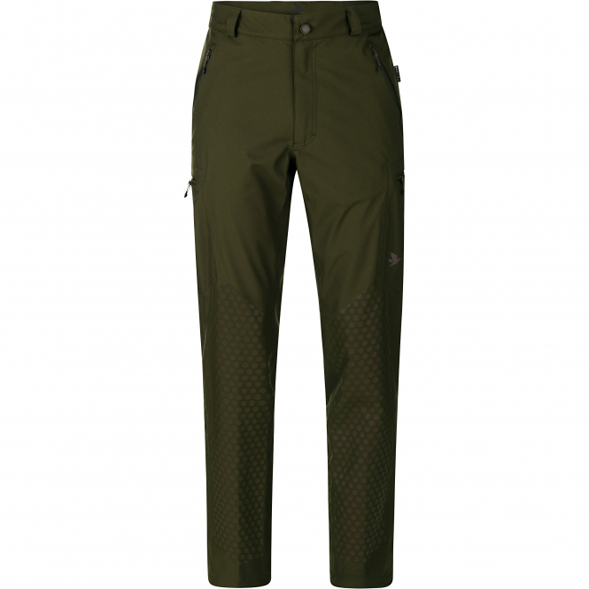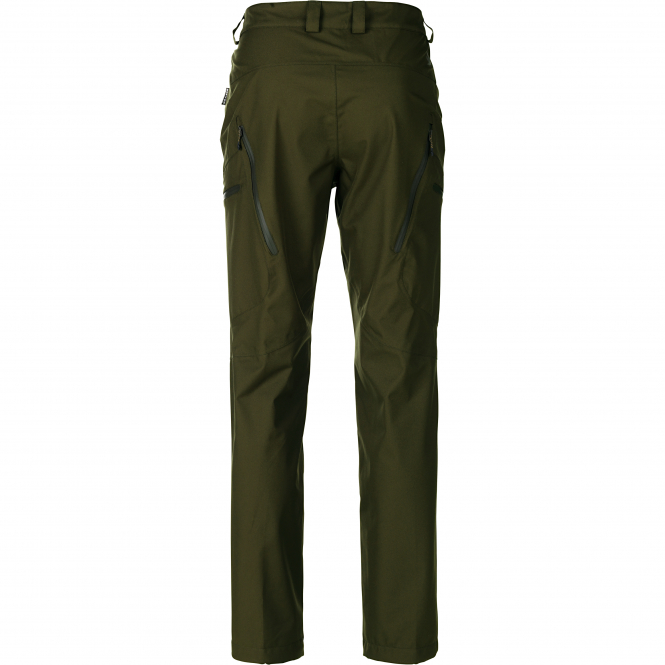 Functional twill trousers with weatherproof features thanks to the incorporated Seetex® membrane. Reinforced knees for extreme durability. The thigh ventilation and the breathable mesh lining creates a comfortable wearing climate. The 2 zipped slip pockets and the 2 zippered leg pockets provide enough storage space for small items. The leg cuffs are adjustable and thus a good protection against penetrating moisture. In addition, these pants are also characterized by their low weight and small pack size. So it is e.g. perfect also for covering in changeable weather, because she does not take away much space in the luggage, if you want to stow them when not in use. Waterproof and breathable (water column: 10.000 mm, breathability: 10.000 g/m²/24h). Colour: pine green. Upper, lining and membrane: 100% polyester.